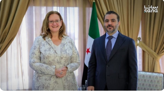 بحث وزير الخارجية والمغتربين أسعد حسن الشيباني مع وزيرة التجارة الخارجية والتنمية الهولندية أوكجيه دي فريز والوفد المرافق سبل تعزيز العلاقات الثنائية والتعاون الاقتصادي والتنموي بين الجمهورية العربية السورية ومملكة هولندا.