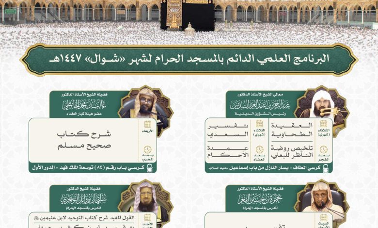 أصدرت رئاسة الشؤون الدينية بالمسجد الحرام والمسجد النبوي جدول البرنامج العلمي الدائم بالمسجد الحرام لشهر شوال 1447هـ.