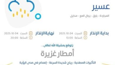 أمطار غزيرة على منطقة عسير.. و”الأرصاد” تنبه متابعة نجاة احمد الاسعد نبه المركز الوطني للأرصاد، اليوم، من تكون…